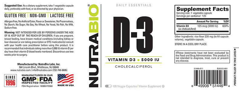 Nutrabio Vitamin D3 5000IU 120 Veggie Caps