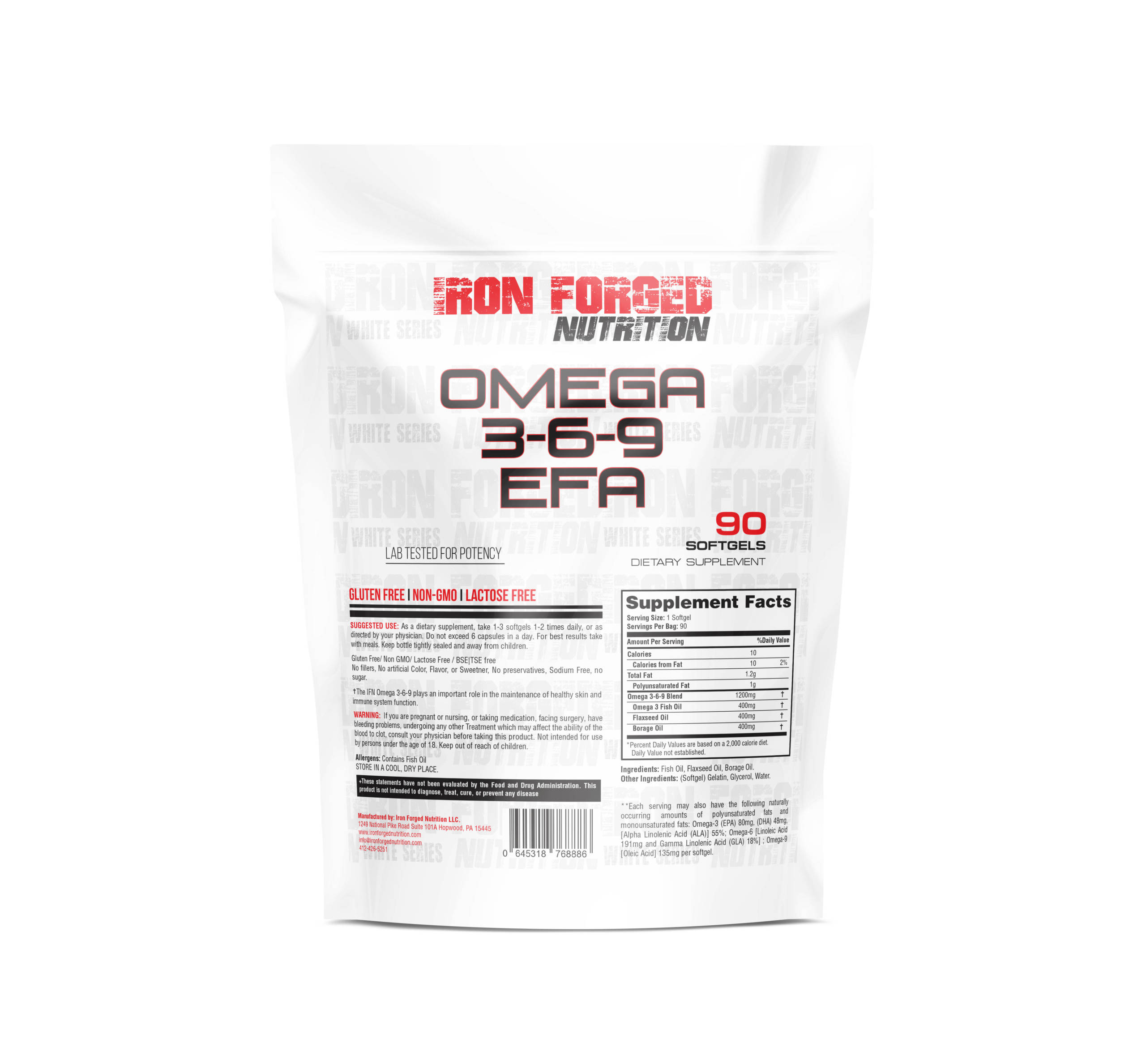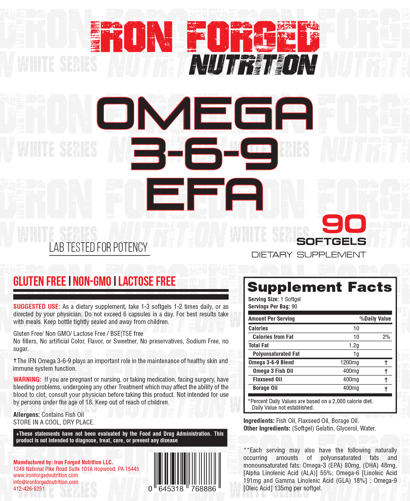 The Iron Forged Nutrition “White series” is a line of products that contain mainly single-ingredient products with no unnecessary fillers or excess ingredients. We added the IFN Omega 3,6,9 to our white series product line because it is an essential basic health supplement that benefits from being packaged with no excess fluff or fillers. There is no need to have anything else with these fatty acids because they have so many benefits on their own, which is why we feel some ingredients are better off on their own, which is why we have the “White Series.” When we first started Iron Forged Nutrition, we wanted to focus mainly on products that produce better results than those currently available. We didn’t want to put out just another creatine, protein, glutamine, and so more unless it was going to be superior to what was currently available. We wanted to create unique and more effective products than competitors. Many companies say these things but end up putting little effort into making this happen or realizing quickly that it will be more complicated and expensive to produce unique products. It is tough to start a supplement company from the ground up, but it is even harder to create a supplement company that does fantastic products or changes things from the norm in the industry. It is harder due to many reasons; here are a few: you can’t just buy a stock formula, you have to source your powders (minimums on quantities), you have to do your testing, and you need to acquire a reliable source for the materials, especially when using rare or cutting edge ingredients, there is a significant risk buying from that source, you need to pay to test 3rd party for what you receive from source to verify their testing , work with a manufacturer who is willing to do smaller minimums if possible (usually custom formulas have higher MQO) and they need to be ready to make multiple test batches which can be very expensive, and there are many more reasons why it is so difficult. As time passed, we realized that sometimes the best products are only occasionally the most unique. They are sometimes simple ingredients that have been tried and true for many years. Our goal with the “White Series” is to use the best quality materials without unnecessary fillers or fluff. In this case, we wanted to deliver a high-quality, clean fish oil product that could provide the essential fatty acids needed for overall health benefits. To accomplish this, we took the Omega 3 fish oil we used in the IFN Omega 3 and added Flaxseed oil and Borage oil, which adds Omega 6 and Omega 9. IFN Omega 3,6,9 product contains 400mg of Omega-3 Fish Oil (72mg EPA and 48mg DHA). 400mg of Flaxseed oil and 400mg of Borage oil total of 1200mg in each soft gel. The recommended dose is 1-3 soft gels 1-2 times daily. This is an essential product that has been around for a long time, and even though we did not innovate the product we did our best to give our customers the product in Its purest form without any extra fluff, which is what our “White Series” line is all about.