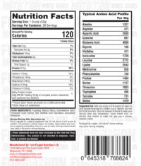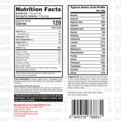 Alanine- 1327mg, Arginine- 471mg, Aspartic acid – 2939mg, Cysteine- 597mg, Glutamic acid- 4508mg , Glycine- 106mg, Histidine- 417mg , Isoleucine- 1728mg, Leucine – 2772mg , Lysine – 2543mg, Methionine- 556mg , Phenylalanine- 756mg, Proline- 1484mg, Serine- 1127mg, Threonine- 1823mg, Tryptophan- 496mg, Tyrosine- 731mg , Valine- 1479mg