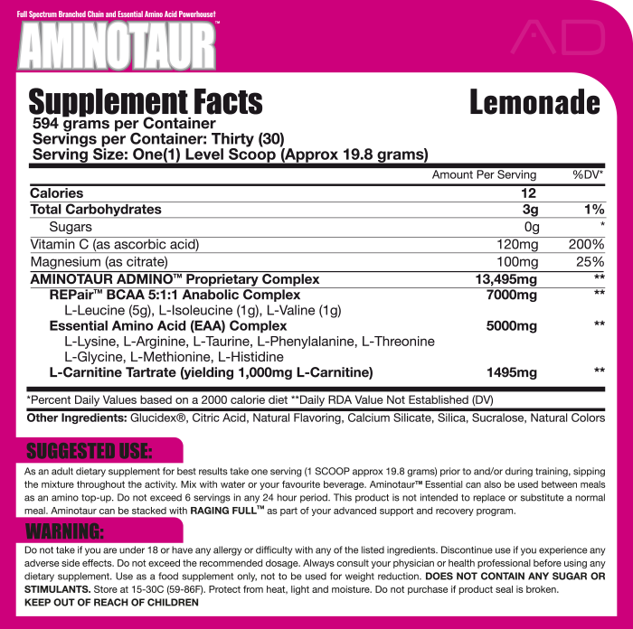 Aminotaur Essential is the perfect partner to stack with AD’s Carb sensation Raging Full at times when optimising recovery and growth is the priority this stack makes a complete pre and intra workout solution to fit ANY athletes needs.